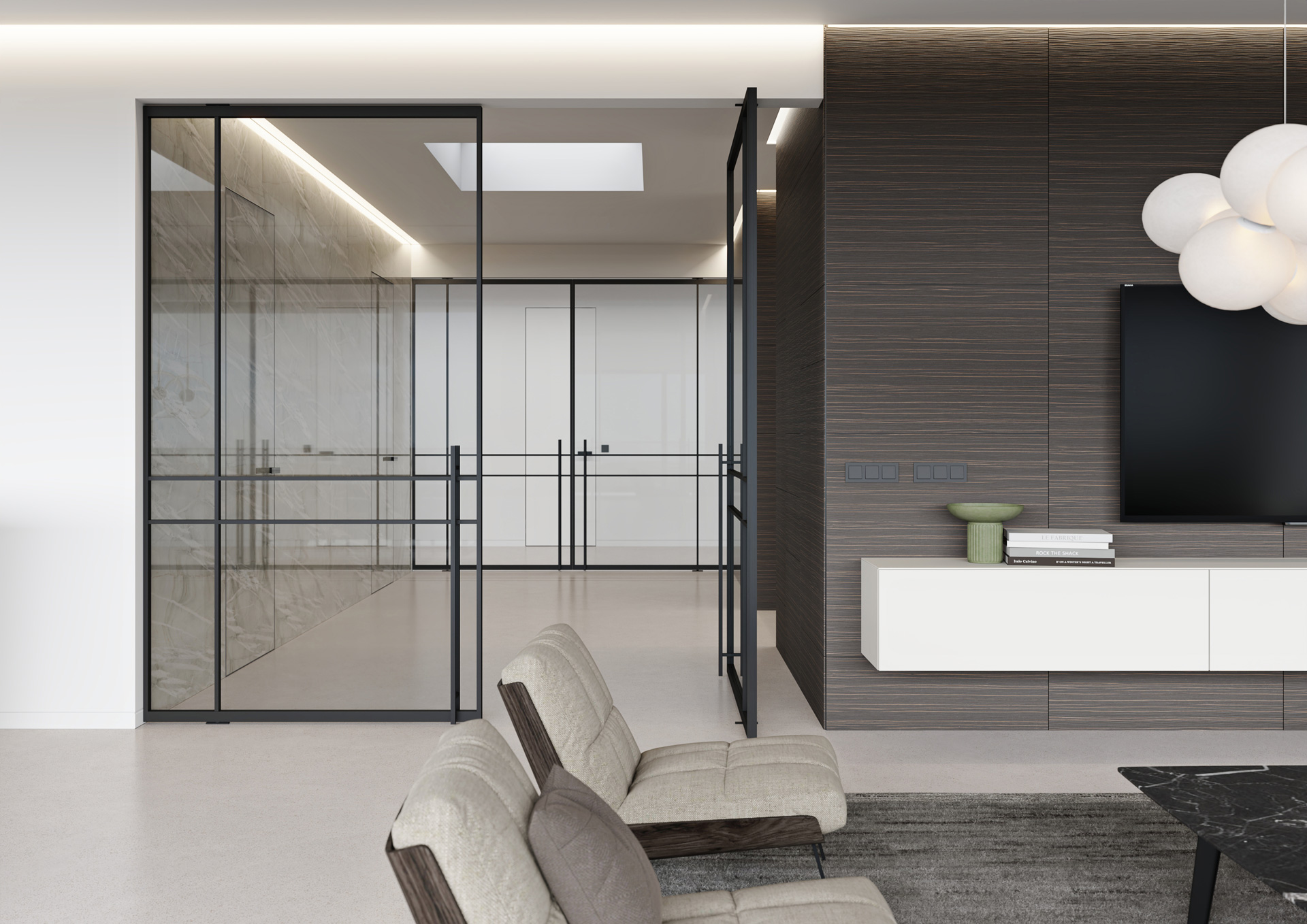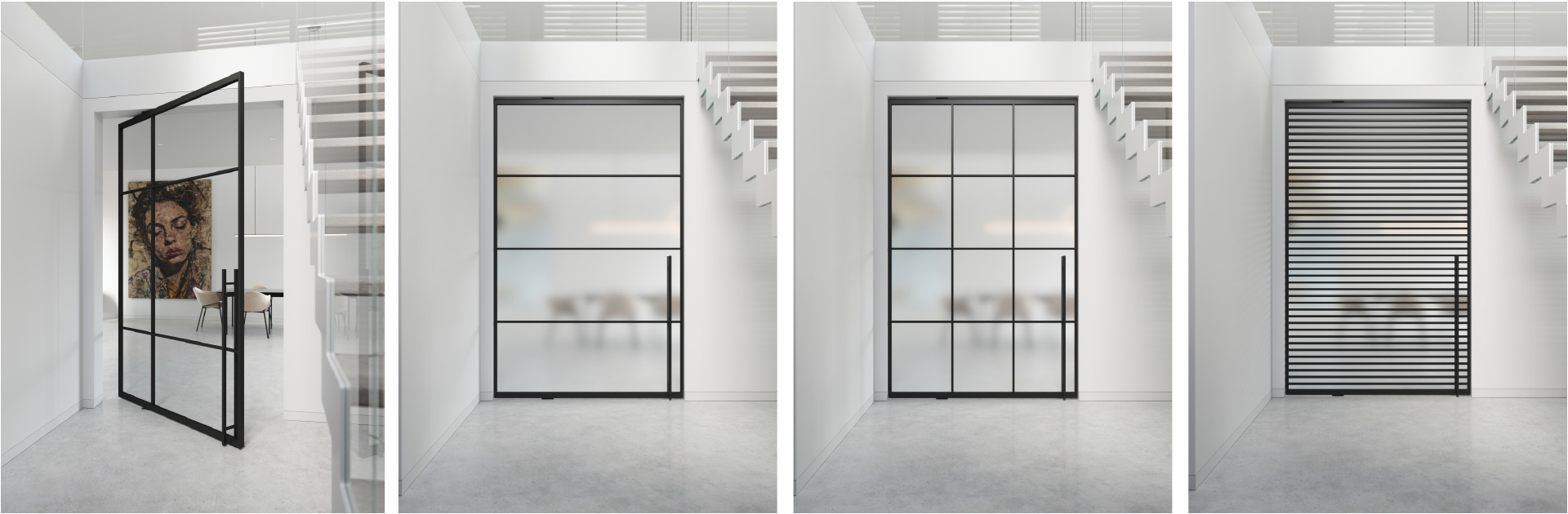 Dveře s hliníkovým rámem a výplní z kaleného skla působí lehce, a přitom vysoce elegantně. Díky pivotovému pantu je umožněno obousměrné otevírání a plynulý chod, což zvyšuje komfort při každodenním použití.