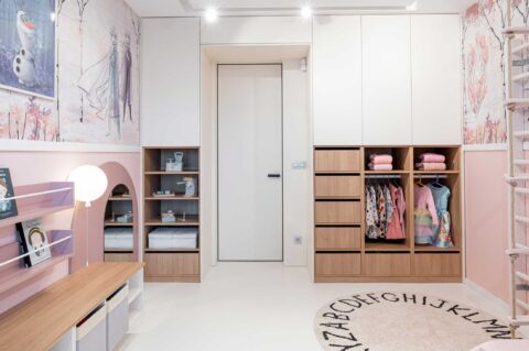 Architekti integrovali principy Montessori, které podporují samostatnost dítěte prostřednictvím snadné dostupnosti všech funkčních zón pokoje.