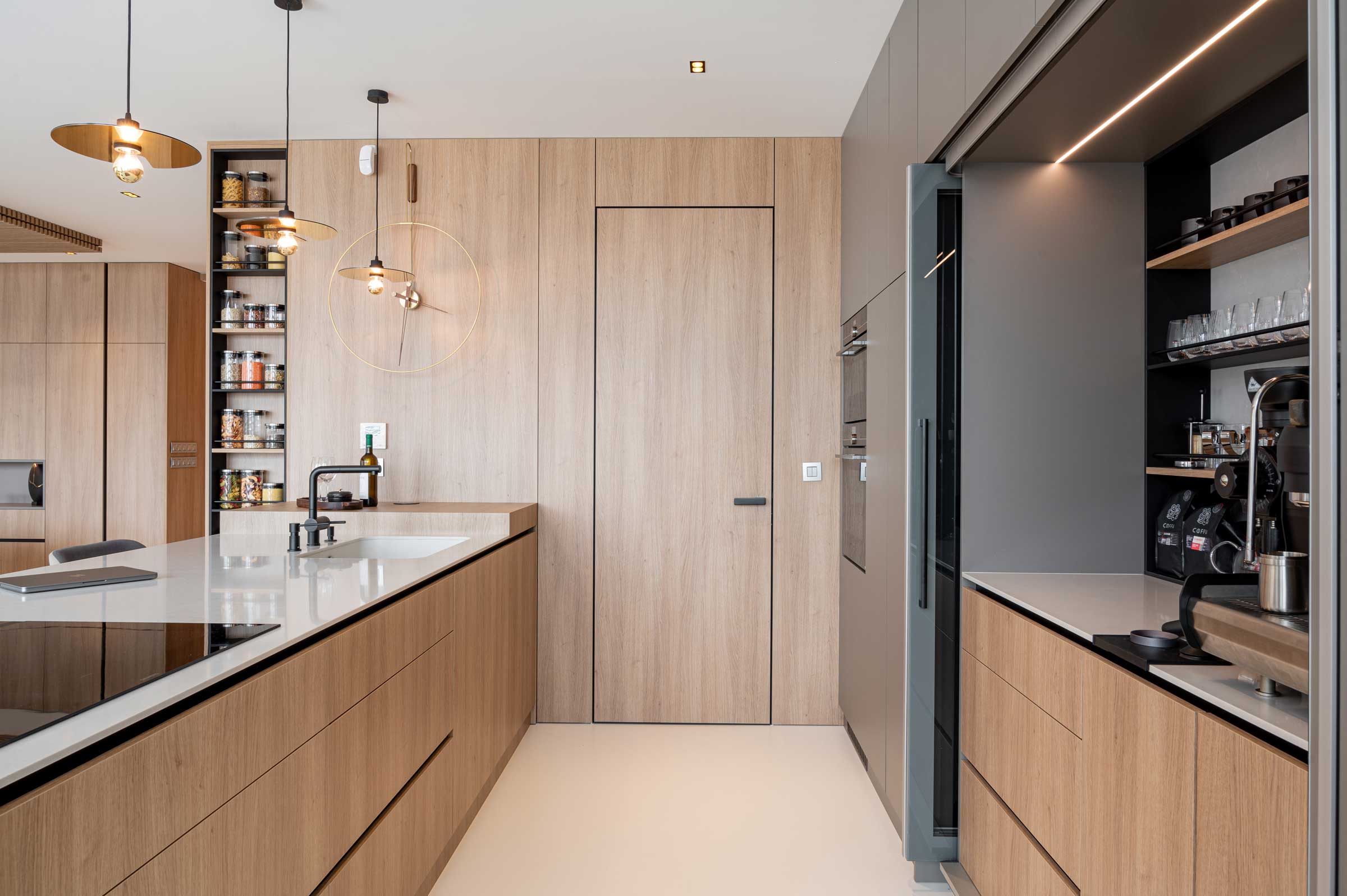 Nábytek i úložné prostory jsou navrženy tak, aby byly intuitivně využitelné a zároveň prostor zůstal vzdušný a nezahlcující.