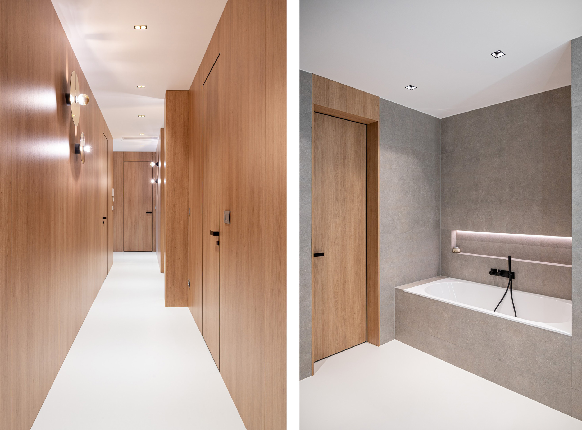 Dveře MASTER ve skryté zárubni a obkladu EFEKTA vytvářejí jednu rovinu. V koupelně je patrná souhra dřevodekoru a kamenných povrchů. Povšimněte si sjednocené podlahy.