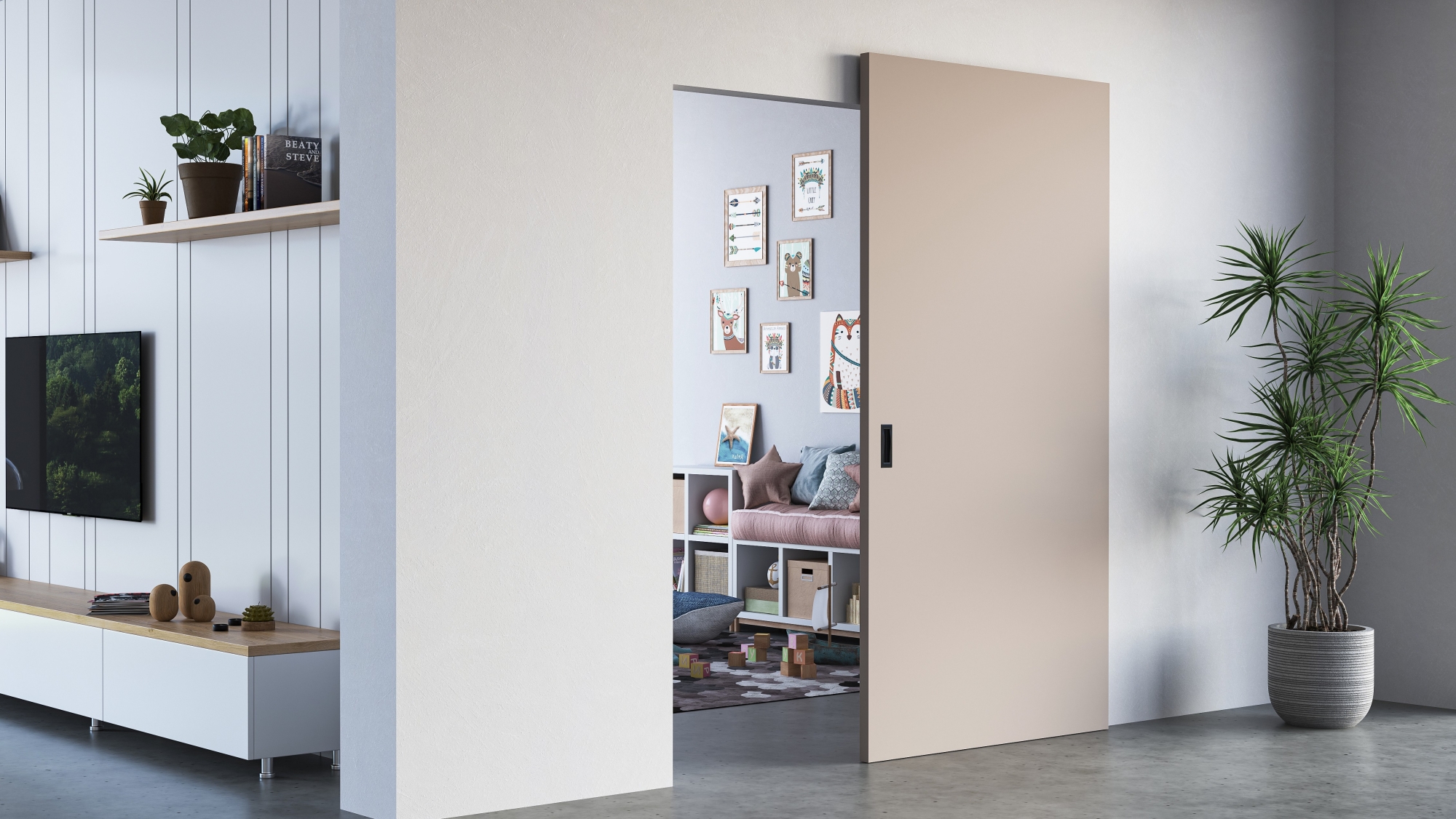 „Například náš unikátní posuvný systém HIDDEN má posuvnou lištu schovanou přímo ve dveřích a obejde se bez garnýže i zárubně. Díky tomu je prakticky neviditelný a dveře vypadají jako by levitovaly před stěnou.